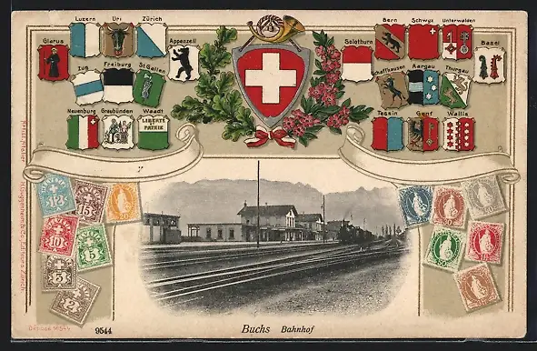 Lithographie Buchs, Bahnhof von der Gleisseite