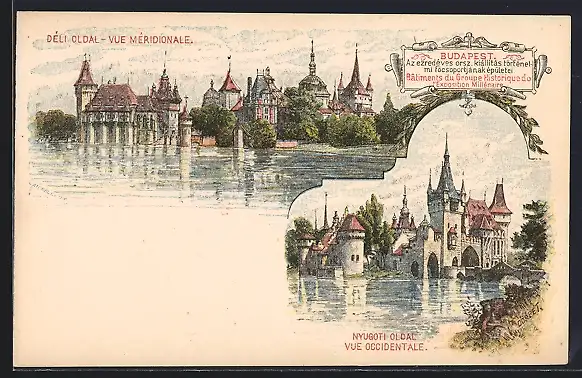 Lithographie Budapest, Batiments du Groupe Historique de l` Exposition Millénaire, Vue Méridionale, vue Occidentale