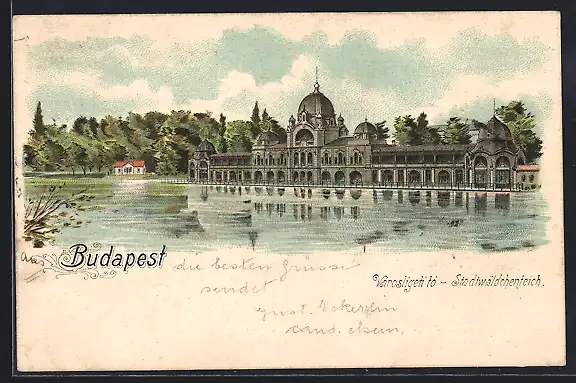Lithographie Budapest, Stadtwäldchen, Blick aufs Ufer des Stadtwäldchenteiches
