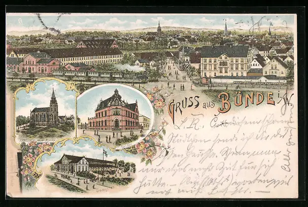 Lithographie Bünde, Post-Amt, Kirche