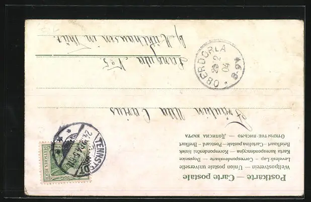 Personenbezogene Daten auf der Rückseite der Karte wurden durch blauen Textmarker unkenntlich gemacht. Die blauen Stellen sind auf die Vorderseite durchgeweicht und wirken sich negativ auf das Postkartenfoto aus