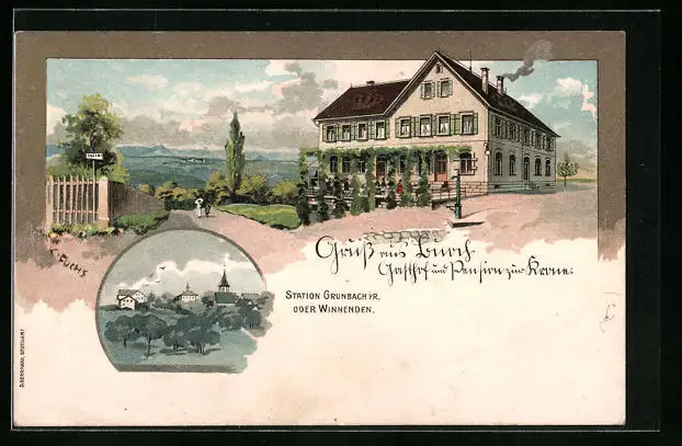 Lithographie Buoch, Gasthof zur Krone mit Aussenbereich