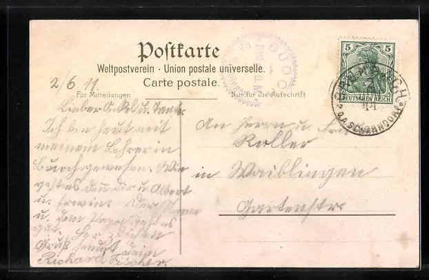 Personenbezogene Daten auf der Rückseite der Karte wurden durch blauen Textmarker unkenntlich gemacht. Die blauen Stellen sind auf die Vorderseite durchgeweicht und wirken sich negativ auf das Postkartenfoto aus