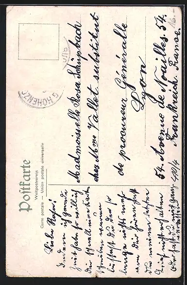 Personenbezogene Daten auf der Rückseite der Karte wurden durch blauen Textmarker unkenntlich gemacht. Die blauen Stellen sind auf die Vorderseite durchgeweicht und wirken sich negativ auf das Postkartenfoto aus
