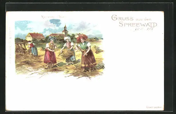 Lithographie Burg /Spreewald, Damen bei der Kornernte