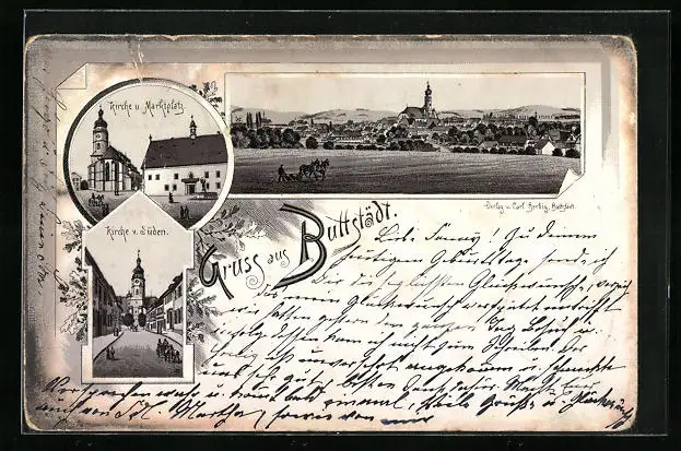 Lithographie Buttstädt, Totalansicht, Kirche u. Marktplatz, Kirche von Süden