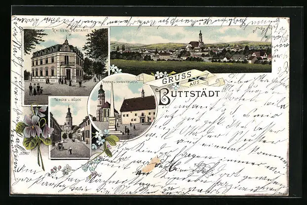Lithographie Buttstädt, Totalansicht mit Kaiserl. Postamt und Kirche