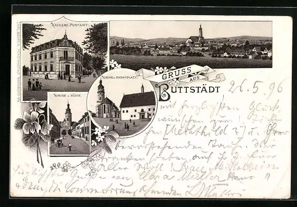 Lithographie Buttstädt, Totalansicht mit Kaiserl. Postamt und Kirche