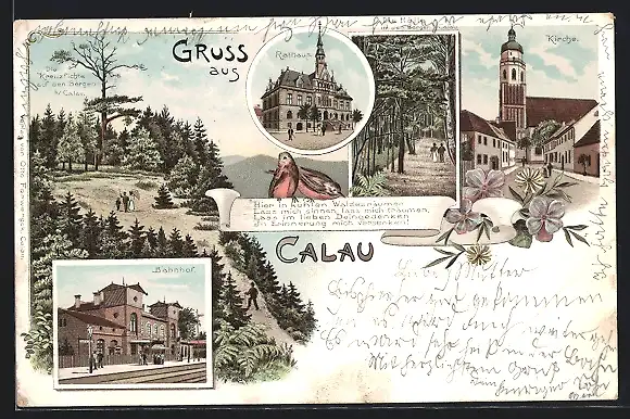 Lithographie Calau, Bahnhof, Rathaus, Kirche