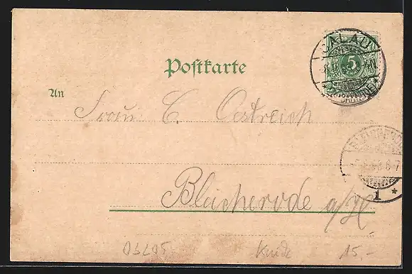 Personenbezogene Daten auf der Rückseite der Karte wurden durch blauen Textmarker unkenntlich gemacht. Die blauen Stellen sind auf die Vorderseite durchgeweicht und wirken sich negativ auf das Postkartenfoto aus