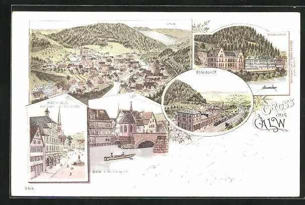 Lithographie Calw, Bahnhof, Handelsschule, Rathaus mit dem Marktplatz