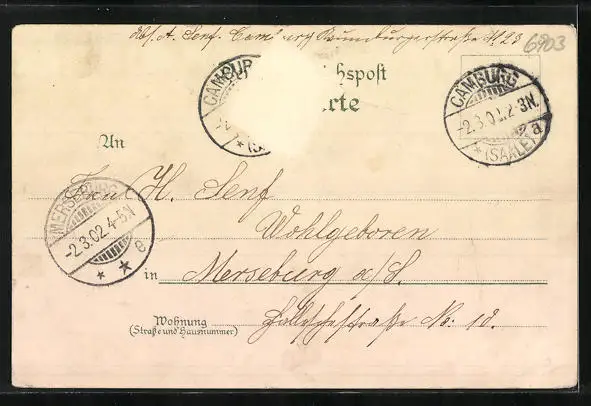 gelaufen 1902, Briefmarke entfernt, rückseitig Oberflächenschaden, Eckknick li. unten, Einriss oben re., guter Zustand