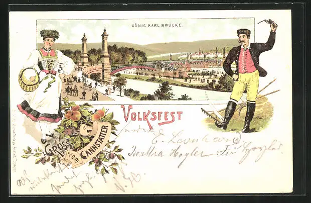 Lithographie Cannstatt, Volksfest, König Karl Brücke