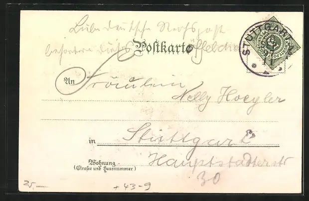 Personenbezogene Daten auf der Rückseite der Karte wurden durch blauen Textmarker unkenntlich gemacht. Die blauen Stellen sind auf die Vorderseite durchgeweicht und wirken sich negativ auf das Postkartenfoto aus