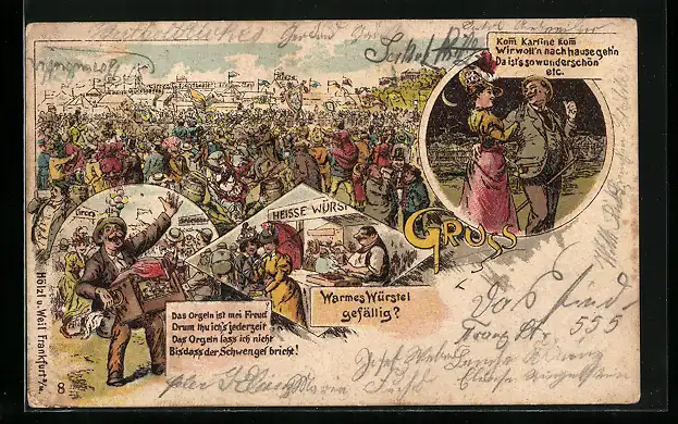 Lithographie Cannstatt, Volksfest, Leierkastenmann, Würstchenbude
