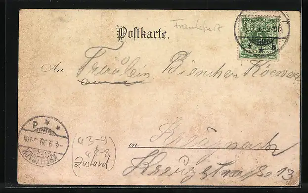 Personenbezogene Daten auf der Rückseite der Karte wurden durch blauen Textmarker unkenntlich gemacht. Die blauen Stellen sind auf die Vorderseite durchgeweicht und wirken sich negativ auf das Postkartenfoto aus