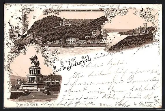 Lithographie Capellen / Koblenz, Ortsansicht mit Schloss Stolzenfels, Kaiserdenkmal