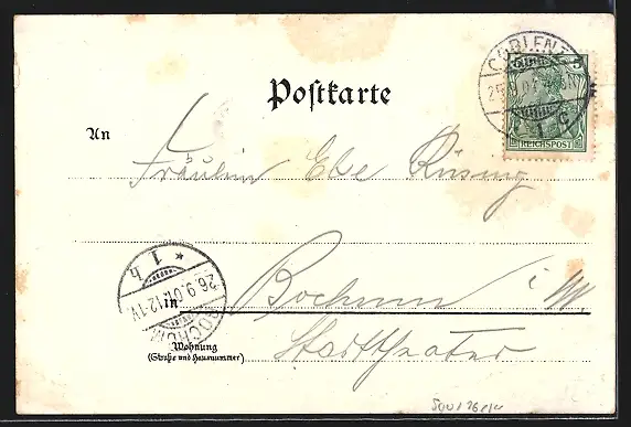 Personenbezogene Daten auf der Rückseite der Karte wurden durch blauen Textmarker unkenntlich gemacht. Die blauen Stellen sind auf die Vorderseite durchgeweicht und wirken sich negativ auf das Postkartenfoto aus