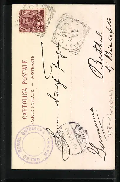 Personenbezogene Daten auf der Rückseite der Karte wurden durch blauen Textmarker unkenntlich gemacht. Die blauen Stellen sind auf die Vorderseite durchgeweicht und wirken sich negativ auf das Postkartenfoto aus