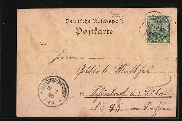 Personenbezogene Daten auf der Rückseite der Karte wurden durch blauen Textmarker unkenntlich gemacht. Die blauen Stellen sind auf die Vorderseite durchgeweicht und wirken sich negativ auf das Postkartenfoto aus