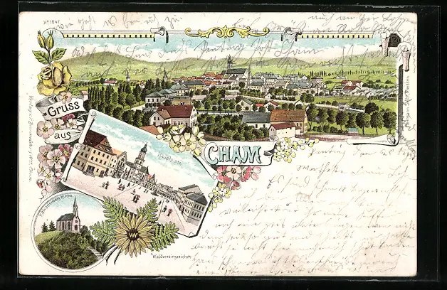 Lithographie Cham, Hauptplatz und Kalvarienberg-Kirche, Panorama