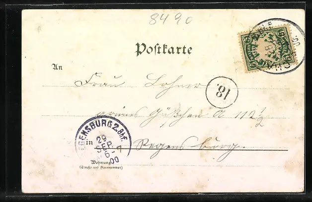 Personenbezogene Daten auf der Rückseite der Karte wurden durch blauen Textmarker unkenntlich gemacht. Die blauen Stellen sind auf die Vorderseite durchgeweicht und wirken sich negativ auf das Postkartenfoto aus