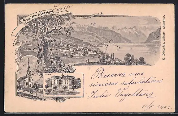 Lithographie Chexbres, College, Kirche, Ortsansicht mit See und Gebirge