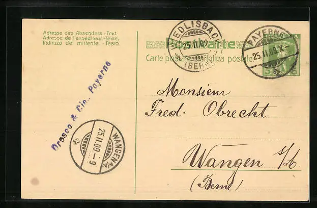Personenbezogene Daten auf der Rückseite der Karte wurden durch blauen Textmarker unkenntlich gemacht. Die blauen Stellen sind auf die Vorderseite durchgeweicht und wirken sich negativ auf das Postkartenfoto aus