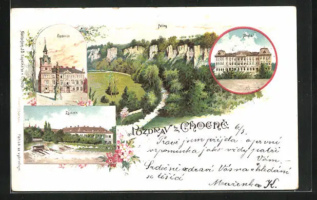Lithographie Chotzen / Chocen, Radnice, Skola, Peliny