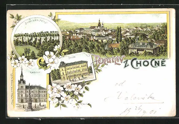 Lithographie Chotzen / Chocen, Skola, Radnice, Knizeci park Peliny