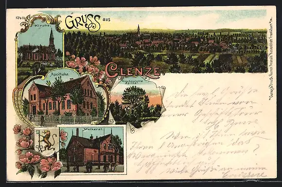 Lithographie Clenze, Apotheke, Molkerei, Panorama