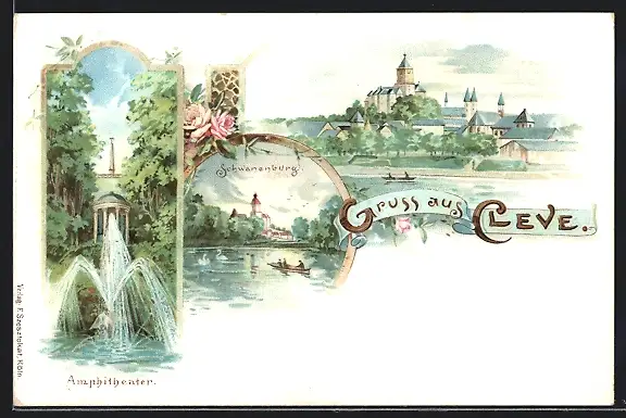 Lithographie Cleve, Amphitheater und Schwanenburg, Teilansicht