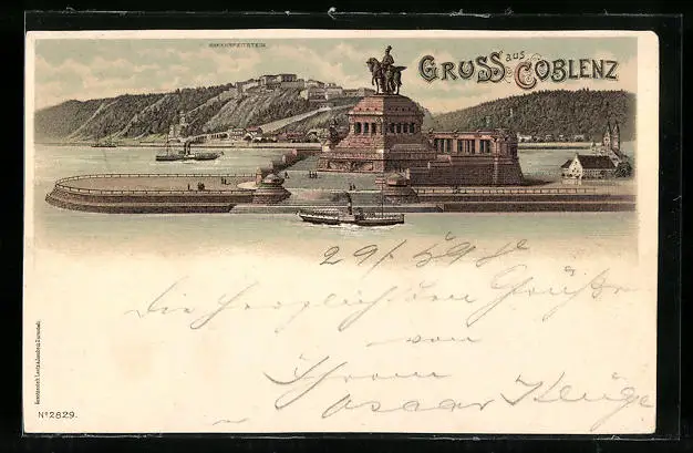 Lithographie Coblenz, Blick auf Ehrenbreitstein und Dampfer