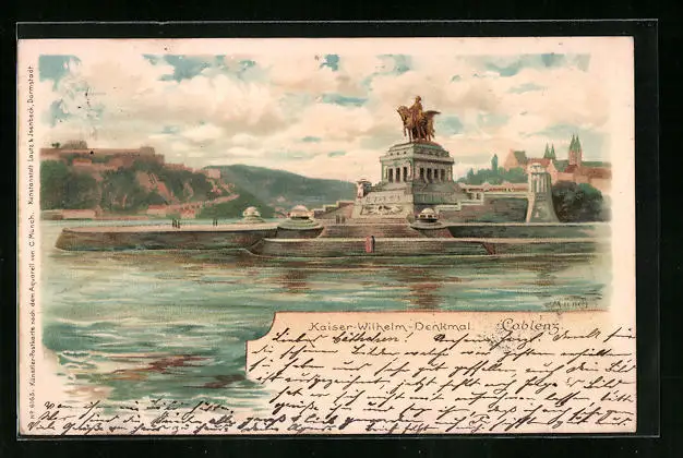 Lithographie Coblenz, Blick auf das Kaiser-Wilhelm-Denkmal