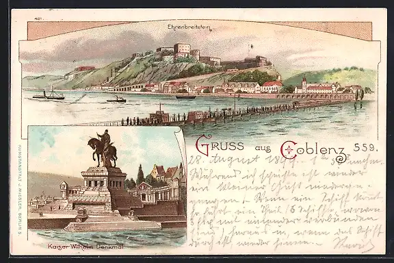 Lithographie Coblenz, Ehrenbreitstein, Kaiser Wilhelm Denkmal