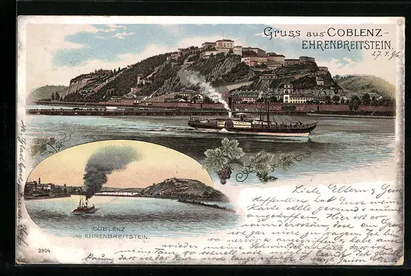 Lithographie Coblenz-Ehrenbreitstein, Ortsansichten mit Rheindampfern