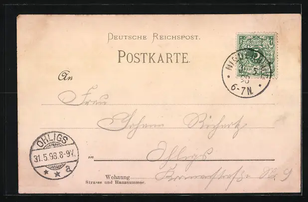 Personenbezogene Daten auf der Rückseite der Karte wurden durch blauen Textmarker unkenntlich gemacht. Die blauen Stellen sind auf die Vorderseite durchgeweicht und wirken sich negativ auf das Postkartenfoto aus