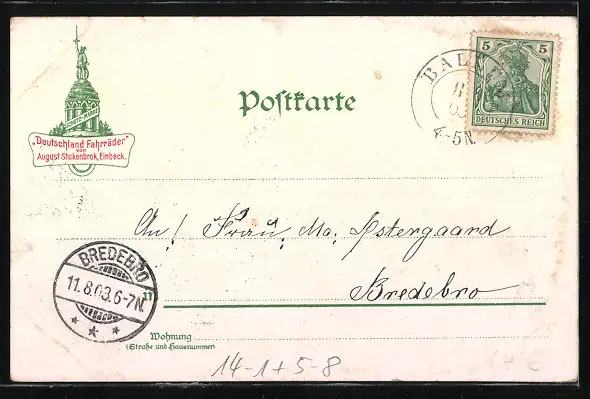 Personenbezogene Daten auf der Rückseite der Karte wurden durch blauen Textmarker unkenntlich gemacht. Die blauen Stellen sind auf die Vorderseite durchgeweicht und wirken sich negativ auf das Postkartenfoto aus