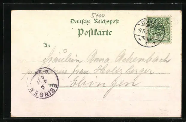 Personenbezogene Daten auf der Rückseite der Karte wurden durch blauen Textmarker unkenntlich gemacht. Die blauen Stellen sind auf die Vorderseite durchgeweicht und wirken sich negativ auf das Postkartenfoto aus