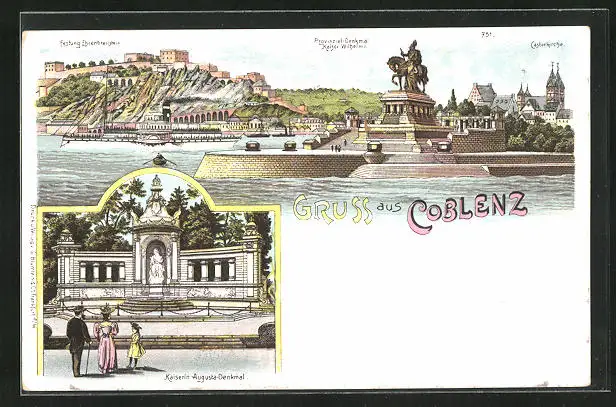 Lithographie Coblenz, Provinial-Denkmal Kaiser Wilhelm, Kaiserin Auguste-Denkmal & Castorkirche
