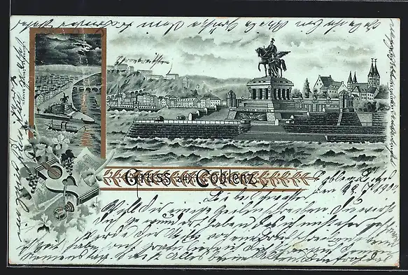 Lithographie Coblenz, Reiterstandbild am Deutschen Eck