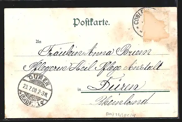 Personenbezogene Daten auf der Rückseite der Karte wurden durch blauen Textmarker unkenntlich gemacht. Die blauen Stellen sind auf die Vorderseite durchgeweicht und wirken sich negativ auf das Postkartenfoto aus