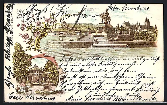 Lithographie Coblenz, Rheinanlage mit Trinkhalle, Provinzial-Denkmal Kaiser Wilhelm I.