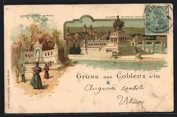 Lithographie Coblenz a. Rh., Kaiserin Augusta-Denkmal, Kaiser Wilhelm-Denkmal