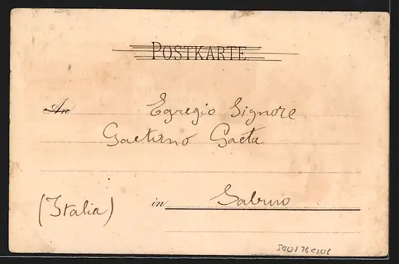 Personenbezogene Daten auf der Rückseite der Karte wurden durch blauen Textmarker unkenntlich gemacht. Die blauen Stellen sind auf die Vorderseite durchgeweicht und wirken sich negativ auf das Postkartenfoto aus