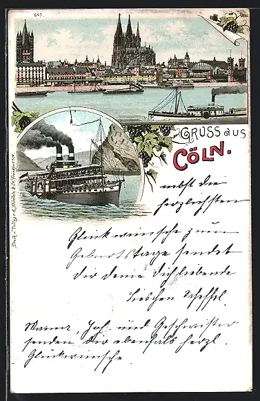 Lithographie Cöln, Dampfer, Ortsansicht mit Dom