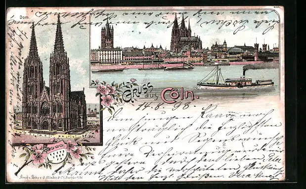 Lithographie Cöln, Flusspartie, Dom