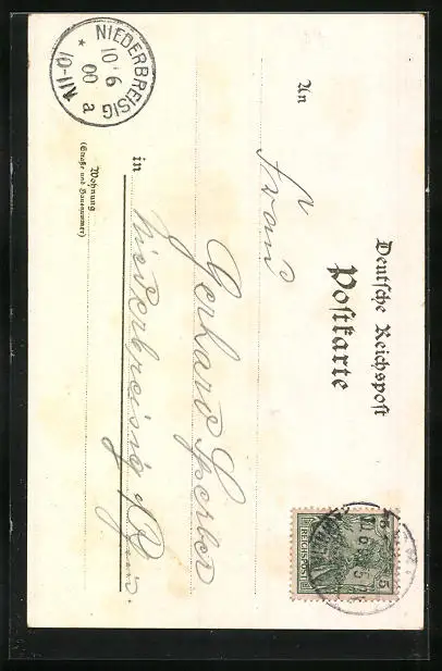 Personenbezogene Daten auf der Rückseite der Karte wurden durch blauen Textmarker unkenntlich gemacht. Die blauen Stellen sind auf die Vorderseite durchgeweicht und wirken sich negativ auf das Postkartenfoto aus