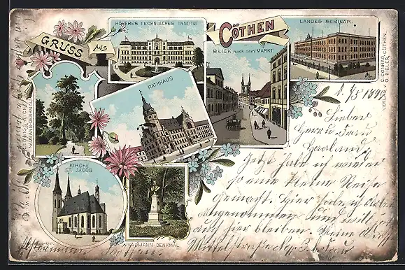 Lithographie Cöthen, Rathaus, Naumann-Denkmal, Kirche St. Jacob