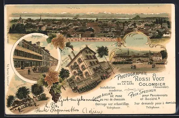 Lithographie Colombier /NE, Photographie Rossi Vogt, Avenue de la Gare, l`arsenal, Rue haute, vue générale